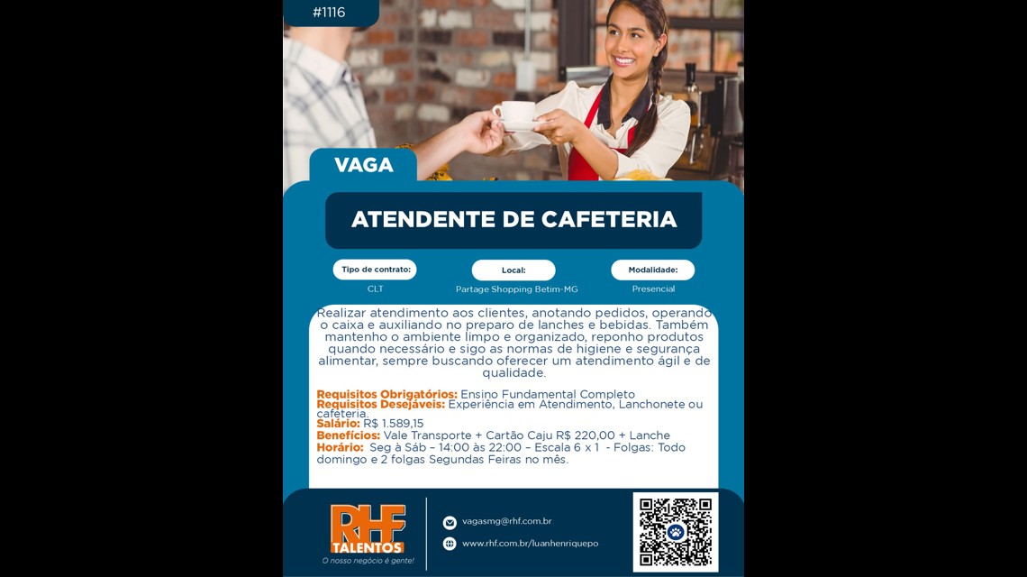 Requisitos Desejáveis: Experiência em Atendimento, Lanchonete ou cafeteria.