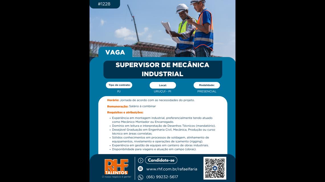 A RHF Talentos – Primavera do Leste está selecionando um Supervisor Mecânico para atuar em obra industrial, com forte presença em campo, liderança de equipes operacionais e garantia da qualidade técnica das montagens mecânicas.