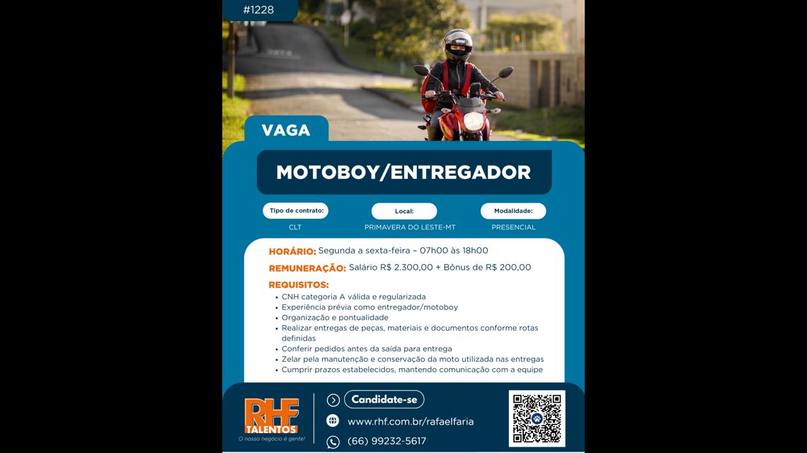 A RHF Talentos – Primavera do Leste está em busca de um(a) Entregador / Motoboy para atuar no transporte de peças e documentos de uma oficina mecânica. Procuramos um(a) profissional comprometido(a), ágil e cuidadoso(a), que garanta entregas seguras e dentro dos prazos.